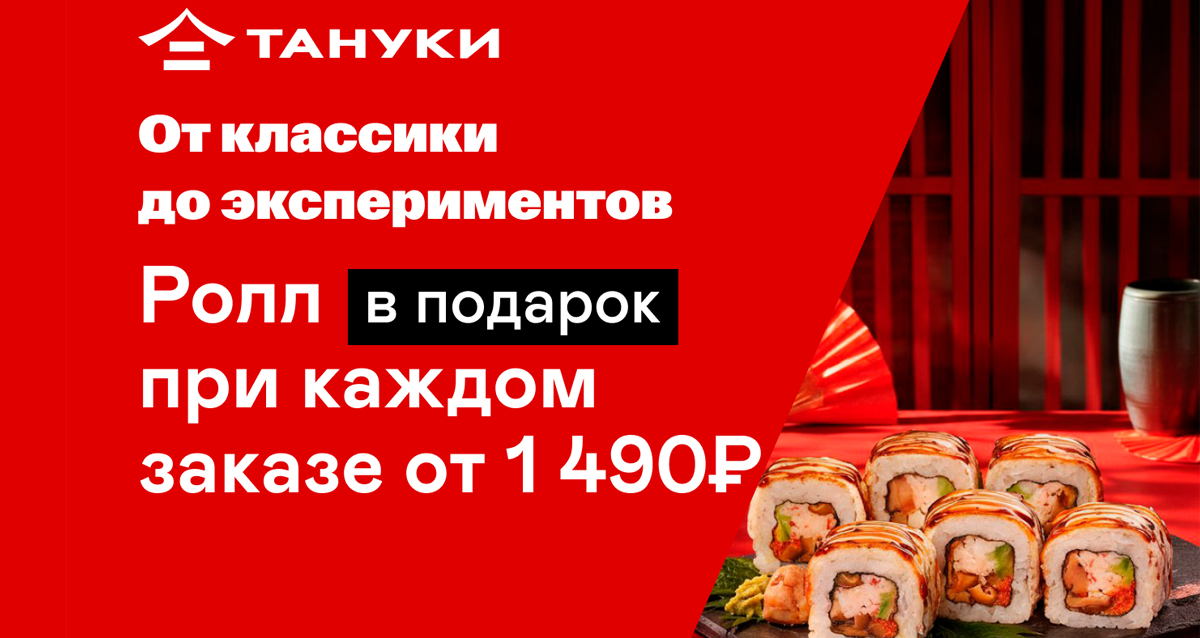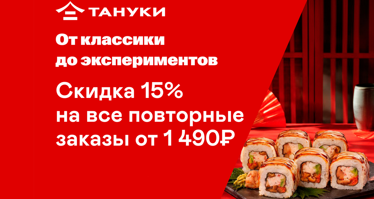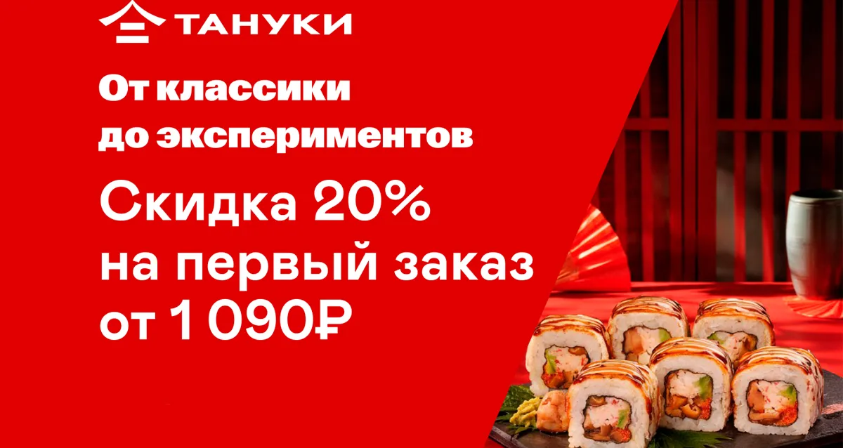 Промокод дает право скидки до 20% на заказ от службы доставки «Тануки».